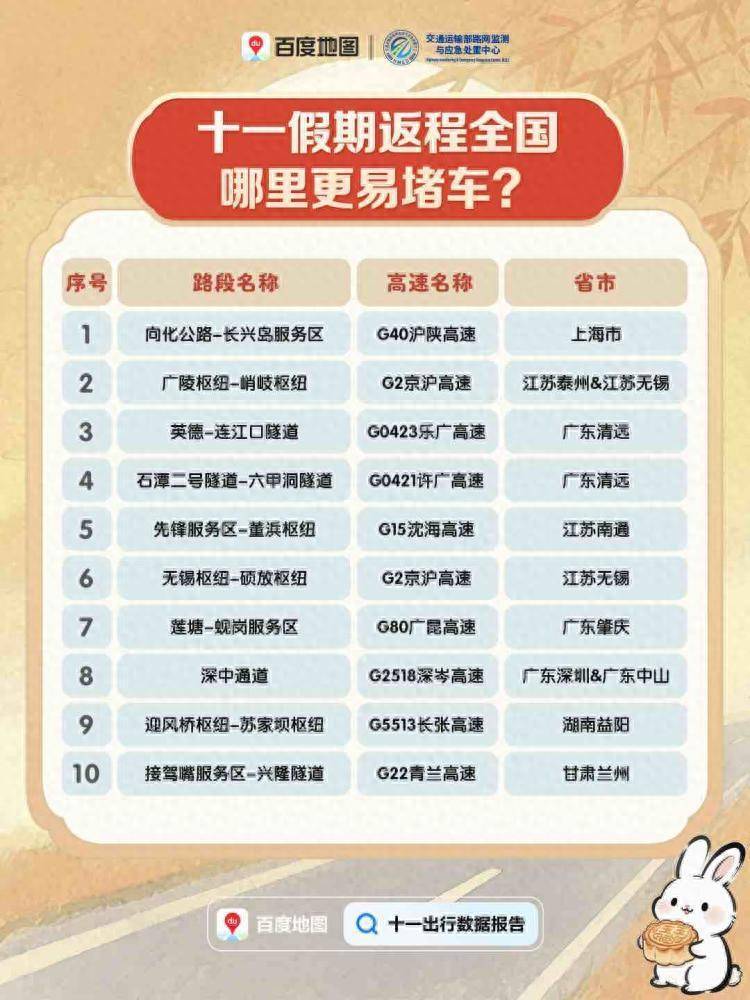 该数据透露,上海辖区内G40沪陕高速向化公路-长兴岛劳动区、江苏泰州和江苏无锡广陵G2京沪高速的广陵要道-峭岐要道、广东清远G0423乐广高速英德-连江口简陋路段、广东清远G0421许广高速石潭二号简陋-六甲洞简陋路段、江苏南通G15沈海高速时尚劳动区-董浜要路途段、江苏无锡G2京沪高速无锡要道-硕放要路途段、广东肇庆G80广昆高速莲塘-蚬岗劳动区路段、广东深圳和广东中山G2518深岑高速的深中通说念、湖南益阳G5513长张高速的顶风桥要道-苏家坝要路途段和甘肃兰州G22青兰高速接驾嘴劳动区-兴盛简陋路段容易发生拥挤。