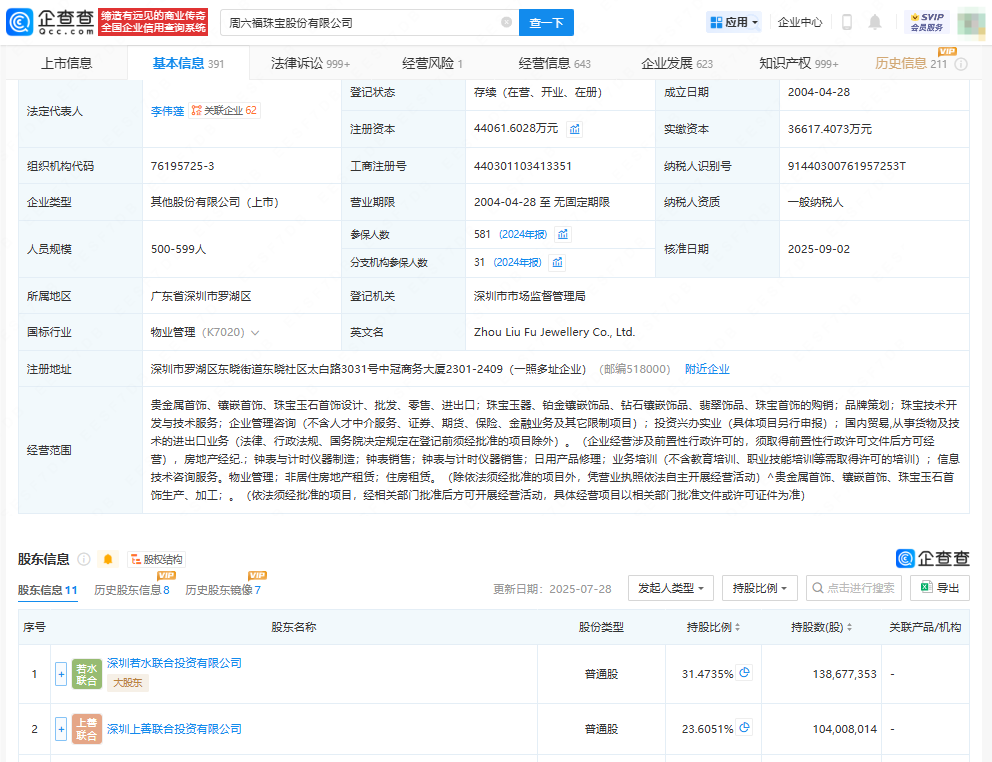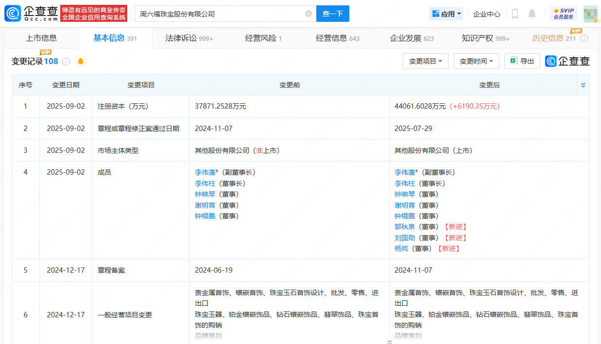 近日,周六福(06168.HK)发生工商变更,注册成本由约3.8亿东谈主民币增至约4.4亿东谈主民币,同期新进多位董事。企查查信息默契,该公司拔擢于2004年4月,由深圳若水连接投资有限公司、深圳上善连接投资有限公司、深圳乾坤连接投资有限公司等共同捏股。